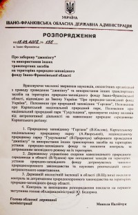 Як повідомляє прес-служба Національного екологічного центру України, в Україні вперше на рівні області видано заборону на проведення змагань із джипінгу. Ініціатива належить Івано-Франківській обласній державній адмінстрації. Розпорядження №138 «Про заборону «джипінгу» та використання інших транспортних засобів на територіях природно-заповідного фонду Івано-Франківської області» видане 18 березня 2008 року. В преамбулі документа згадується, що своїй появі розпорядження ...