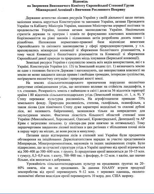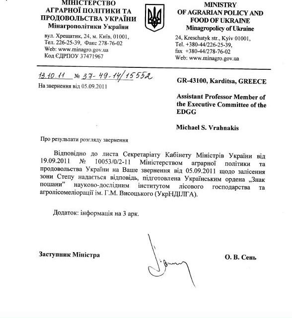 According to the letter of the Cabinet of Ministers of Ukraine dated 19.09.2011 Ministry of Agriculture and Food of Ukraine on your appeal from 05.09.2011 № 10053/0/2-11 about afforestation of the Steppe zone provided a response prepared by Ukrainian Order “Badge of Honor” GM Vysotsky Research Institute of Forestry and agroforestry (URIFFM).