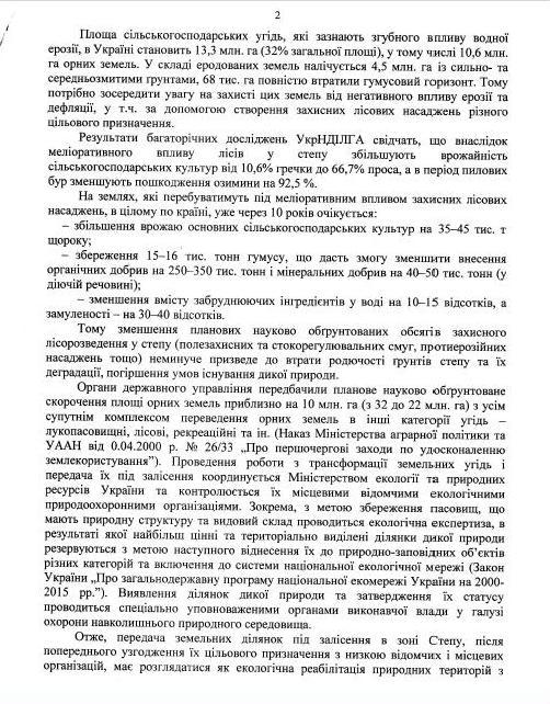 State agencies have elaborated gradual and scientifically-based decrease of plow-land areas approximately by 10 millions ha (from 32 mil. to 22 mil. ha) for transformation of them into other land categories: meadows and pastures, forests, recreation territories and other. (Order of Ministry of Agricultural Politics and Ukrainian Academy of Agrarian Science No26/33 dated April 2000 “About urgent measures for land application improvement”).
